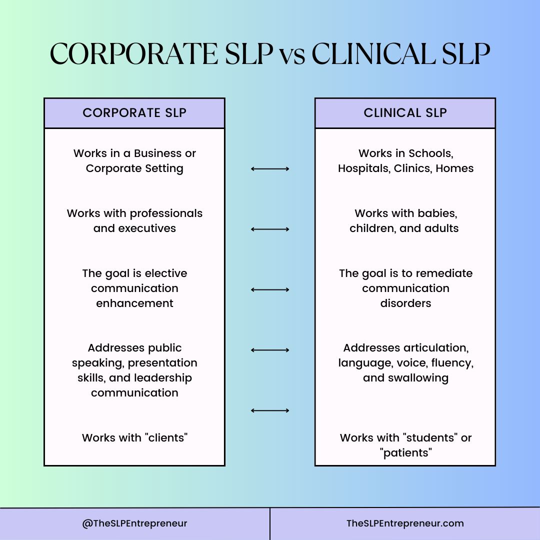 Corporate SLPs work in business or corporate settings and typically refer to their clients as "clients" rather than "patients" or "students."